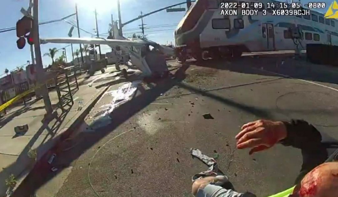 En el video se ve a una avioneta Cessna 172 estrellada en las vías del tren, a tan solo unas cuantas cuadras del departamento de la policía de Los Ángeles en Foothills Division.
