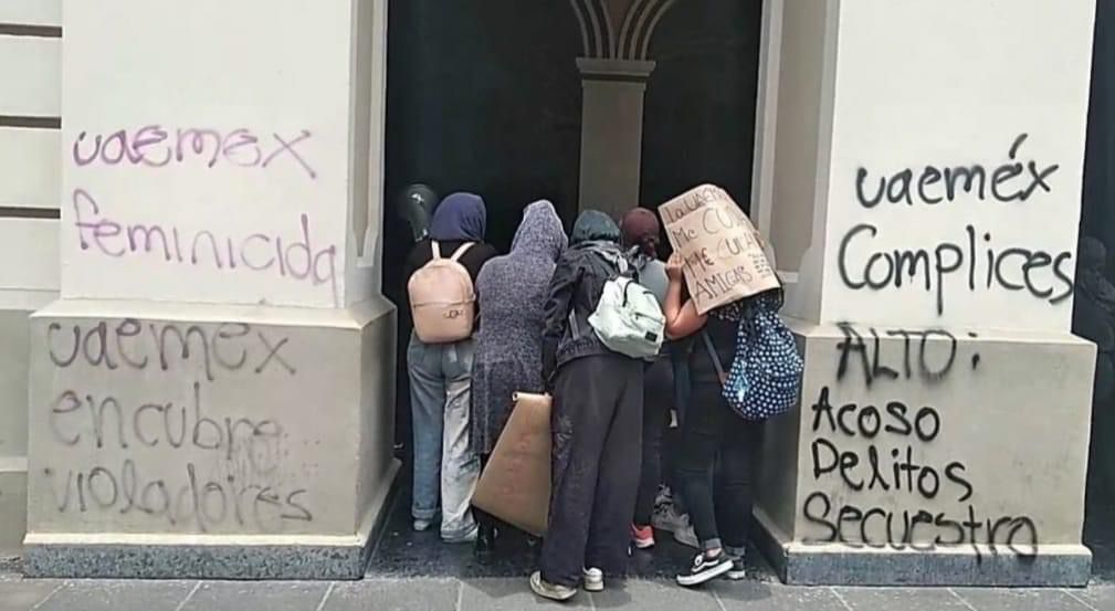 Un grupo de estudiantes y colectivas feministas realizaron pintas en la entrada de Rectoría de la Universidad Autónoma del Estado de México (UAEMex) en protesta por supuestos casos de acoso dentro de la institución.