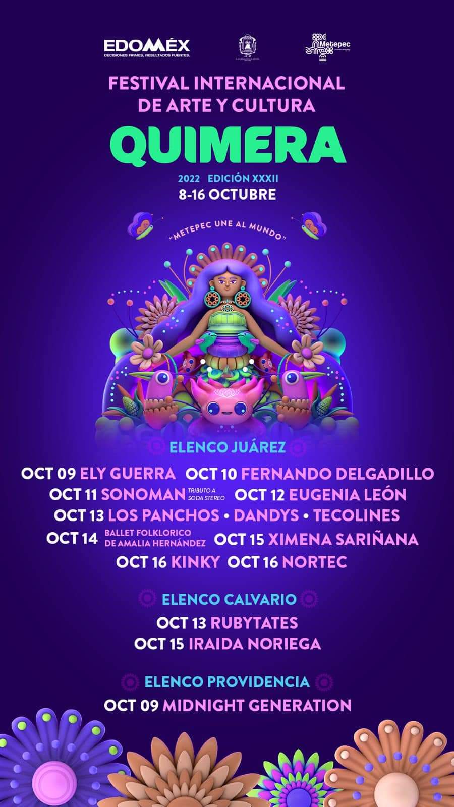La trigésima segunda edición del Festival Internacional de Arte y Cultura Quimera 2022, celebrada en Metepec, reunirá a más de 150 artistas y siete países invitados, la participación más nutrida en la historia del acontecimiento cultural más importante del Estado de México.