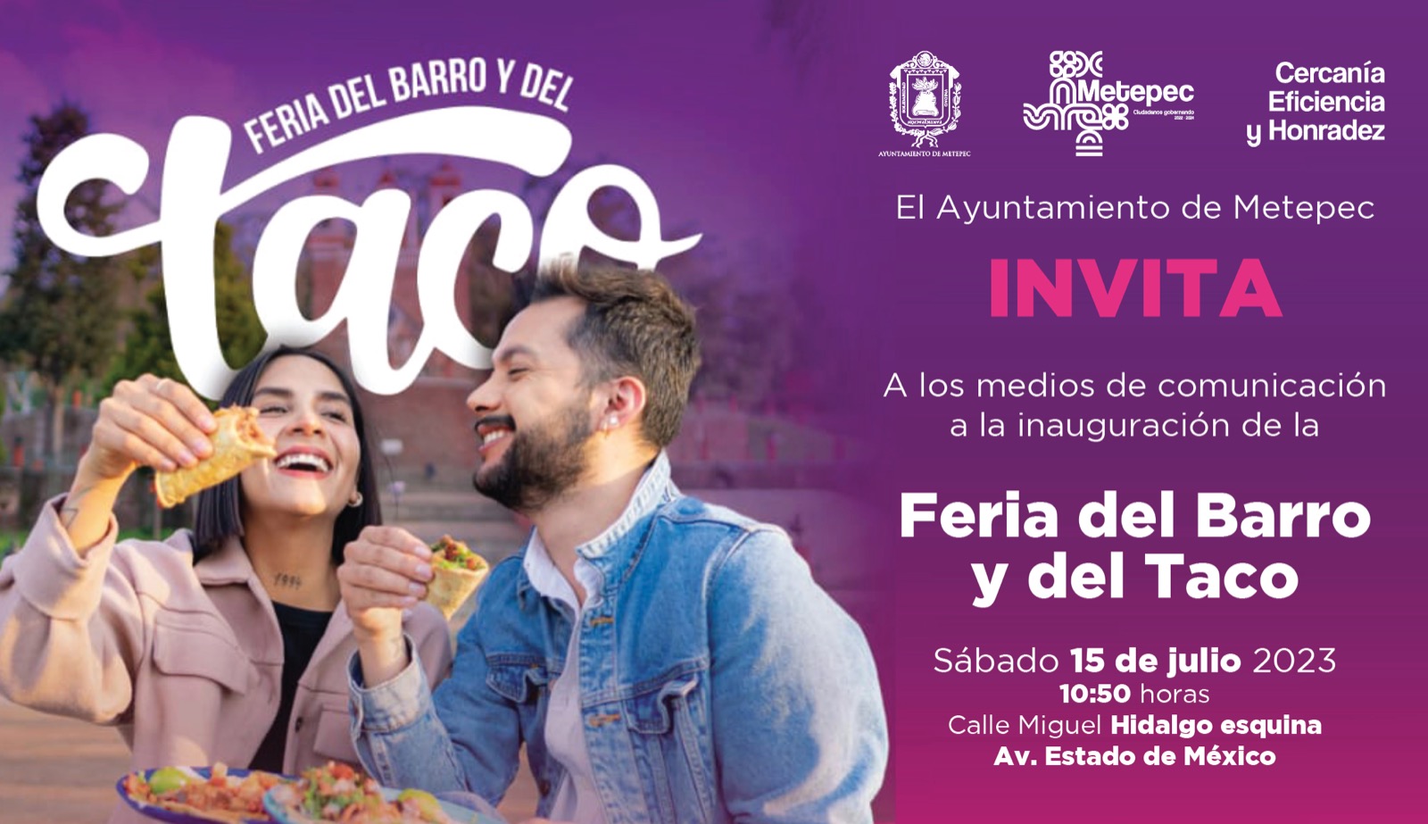 Estatal Feria del Barro y del Taco en Metepec por 14 de julio, 2023 Comentarios 0 El gobierno de Metepec invita a la Feria del barro y del taco que se llevará a cabo este sábado 15 de julio a partir de las 11:00 a.m. en calle Miguel Hidalgo esquina Av. Estado de México. Comparte esto: Compartir en X (Se abre en una ventana nueva) X Comparte en Facebook (Se abre en una ventana nueva) Facebook Me gusta esto:Me gusta Cargando... 0 comments on “Feria del Barro y del Taco en Metepec” Deja un comentarioCancelar respuesta Navegación de entradas Entrada anterior Entrada siguiente