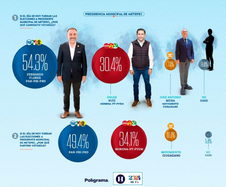 De acuerdo con la encuesta de Poligrama-Heraldo Media Group, Fernando Flores Fernández, candidato a alcalde de Metepec por la coalición PAN-PRI-PRD, aventaja por casi 24 puntos a su más cercano competidor.