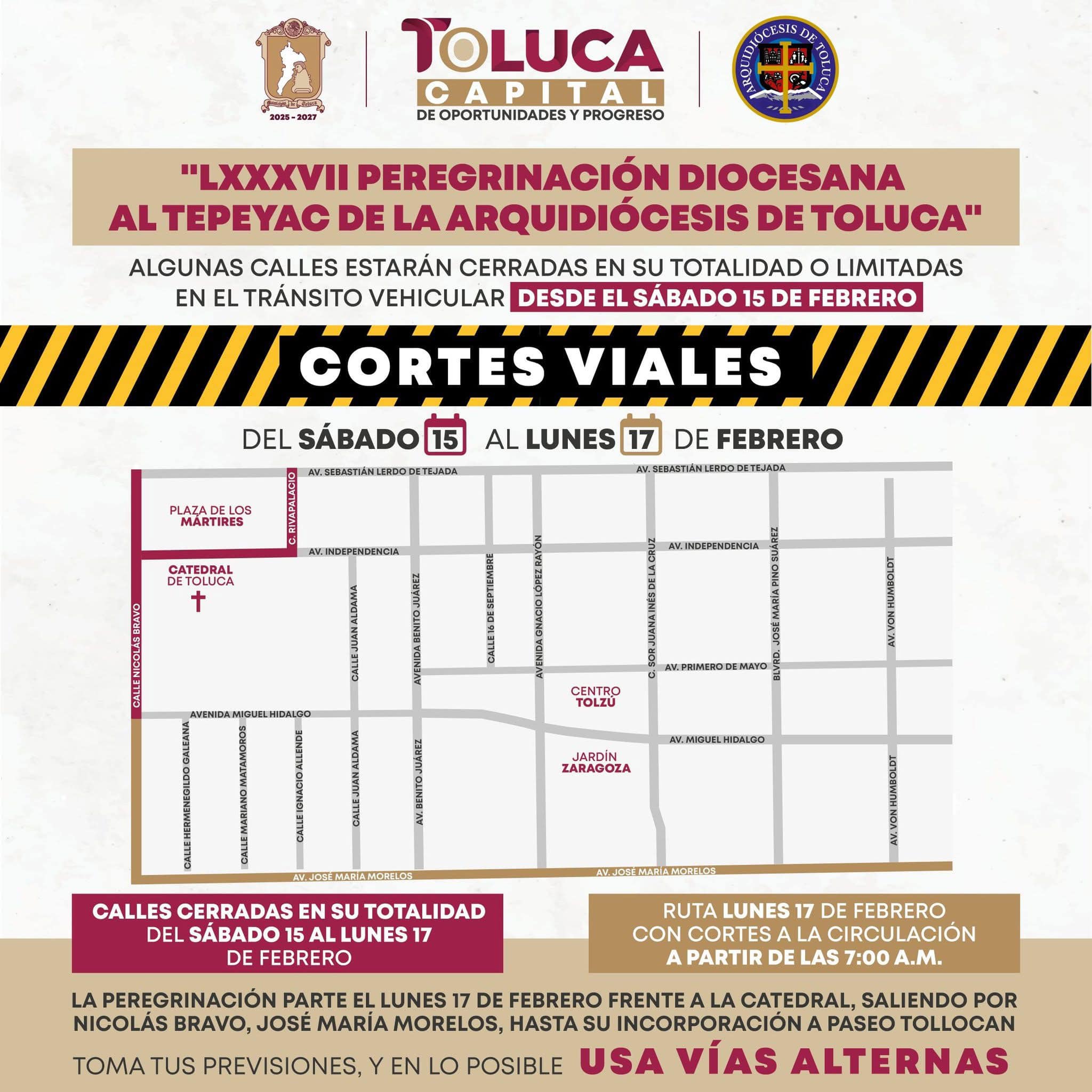 Del 15 al 17 de febrero se realizará la 87ª peregrinación anual de la Arquidiócesis de Toluca a la Basílica de Guadalupe, lo que provocará cierres y afectaciones viales en la capital mexiquense.