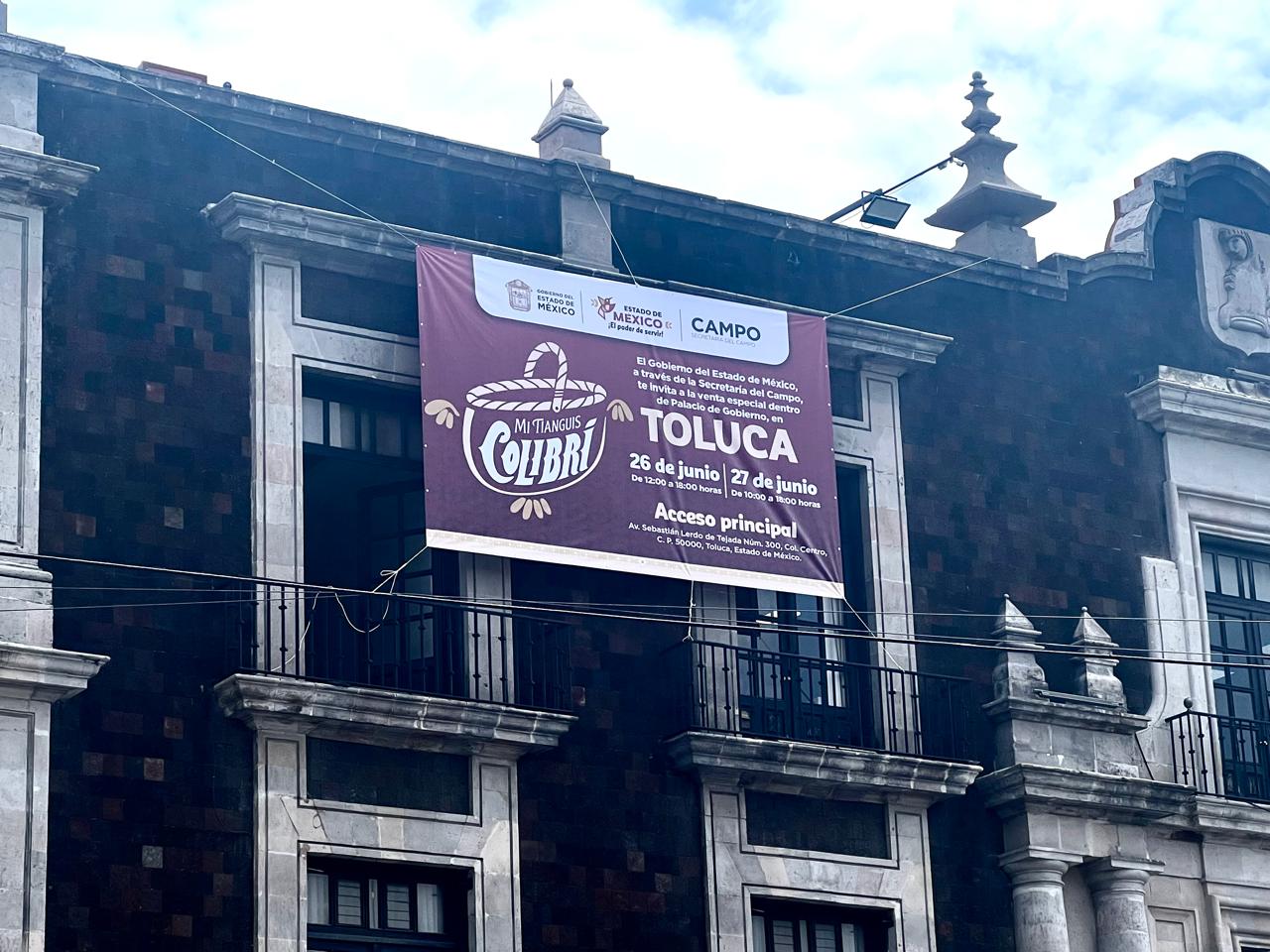 Toluca, Estado de México, 27 de junio de 2025. El Palacio de Gobierno de Toluca, sede del Poder Ejecutivo estatal y uno de los edificios más emblemáticos del Estado de México, fue cubierto con vinilonas promocionales del evento “Mi Tianguis Colibrí”, organizado por la Secretaría del Campo.