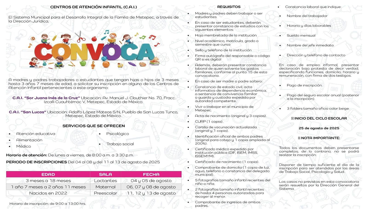 Metepec, Estado de México, agosto de 2025.– El Sistema Municipal DIF de Metepec, a través de su Dirección Jurídica, lanzó la convocatoria de inscripción para madres y padres trabajadores o estudiantes que tengan hijos e hijas de entre 3 meses y 3 años 7 meses de edad.