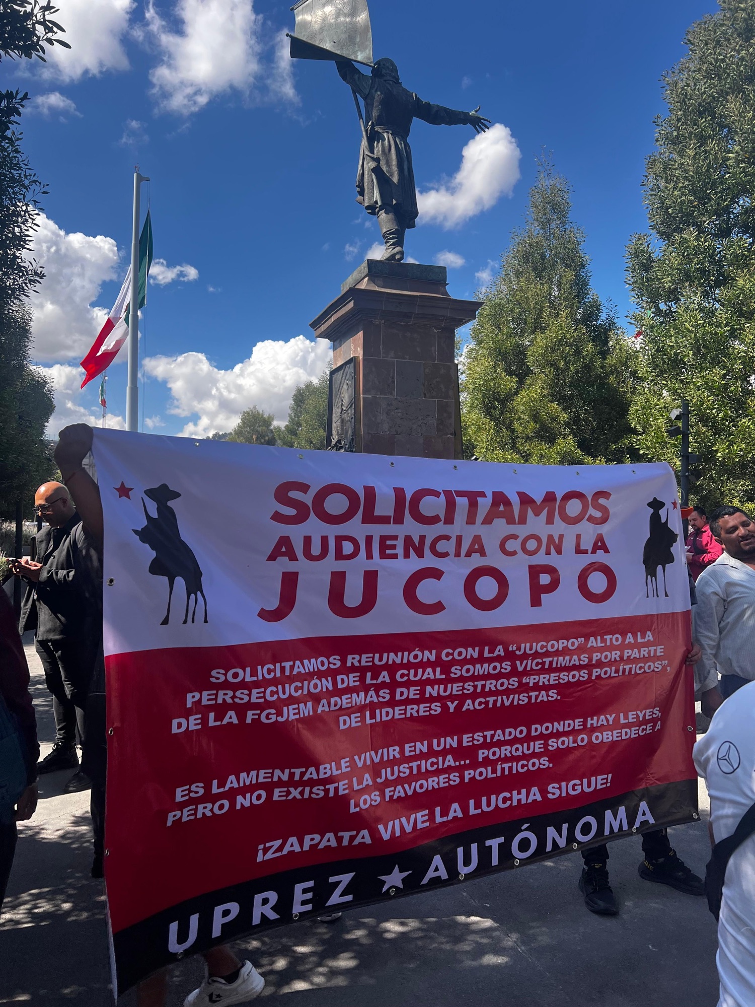 Integrantes de UPREZ Autónoma realizaron este jueves una protesta frente al Palacio Legislativo del Estado de México, en la Plaza Cívica de Toluca, para exigir la liberación inmediata de tres de sus compañeros y solicitar formalmente una audiencia con la Junta de Coordinación Política (Jucopo) del Congreso local, que preside el diputado Francisco Vázquez.
